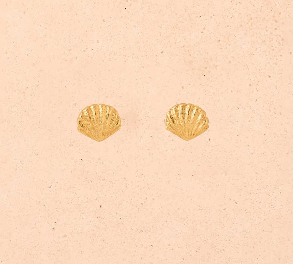 Small, detailed seashell stud earrings, with scalloped edges. Their symmetrical shape, soft ridges and wavy surface echo those of the shells washed ashore.