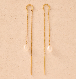 A bold reimagining of the Agapee Ariane threader earrings, with a striking freshwater pearl and a softly curved loop to keep the thin chain secure.