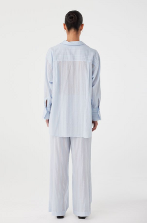 Oversized and effortlessly tailored, the Priya Shirt features a subtle textured stripe and sheer cotton weave. Designed to layer with ease, over swim, sets, or solo.