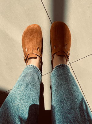 Handmade by Bosabo in Brittany, France, these closed-toe slides are simply the most comfortable you can find, with an anatomical cork sole and rubber underneath, they are lined with sheepkin which feels so sumptuous on the foot and a soft nubuck leather upper with adjustable strap.