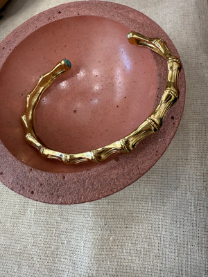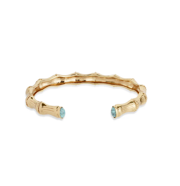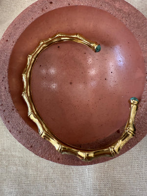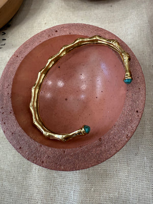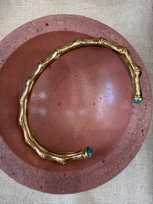 Gold-plated bangle bracelet cuff with delicate twisted bows and cabochons of fine turquoise stones at the ends.