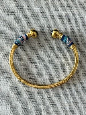 Gold plated bracelet embellished with tinted threads. The bracelet is adorned with glass beads at ends. Adjustable size.