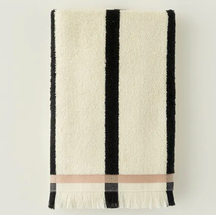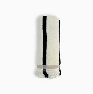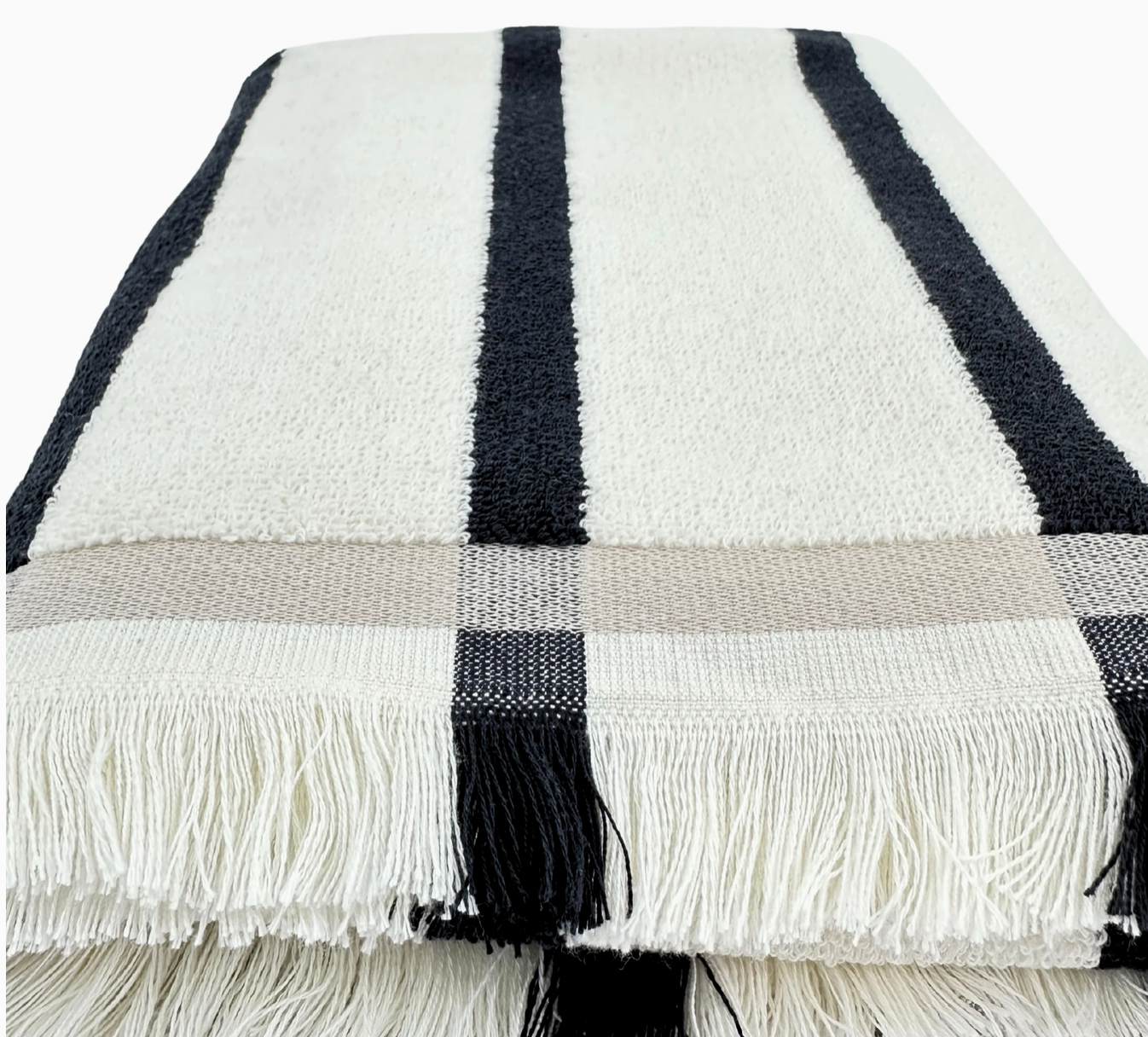 Our colourful XL peshtemal is woven from 100% Turkish cotton, featuring white and black stripes with short fringes. Lightweight yet absorbent, it dries quickly and packs easily—perfect as a bath towel, beach towel, spa wrap, or travel essential.
