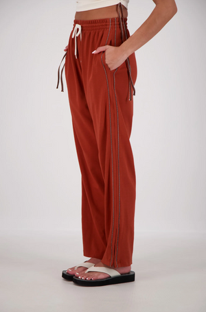 Experience ultimate comfort with the Manarola Trackpant in Tobacco. Crafted from the Jasmine Alexa signature buttery soft cotton, these trackpants feature a relaxed fit and an elastic waistband with a drawstring for a perfect, adjustable fit. Stylish contrast stripe piping and side hem splits add a touch of elegance, while two side pockets offer practicality. Designed to wash and wear, they effortlessly transition from casual days to dressed-up occasions. Elevate your everyday wardrobe with these versatile, easy-care trackpants.
