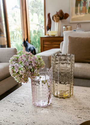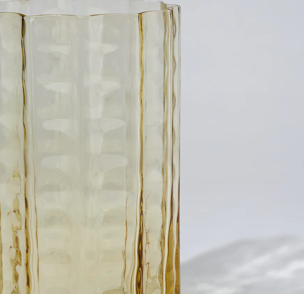 Playful curves. Sculptural presence. This large Jelly Vase in rich, translucent golden glass makes a bold statement in any space. Its rippled silhouette and vintage-inspired form bring instant character — perfect for oversized blooms or styled solo on a console or dining table.