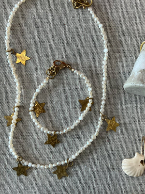 The Lulu bracelet is made with brass stars and pearl beads.