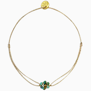 A minimalist and very delicate bracelet. Small flower in real turquoises and gold-plated ball Adjustable by two sliding knots The perfect summer jewellery to accumulate with our other turquoise bracelets.