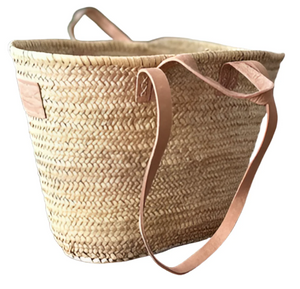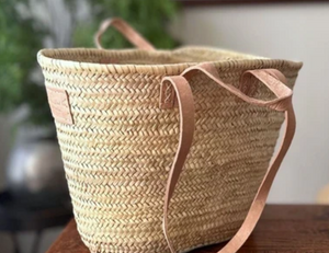 The Market Baskets are genuine, French-inspired baskets imported from Morocco. Each basket is handwoven from palm leaves. The Market Basket handles are made from genuine Moroccan leather which are sewn on by hand. Our non-leather handles are made from firmly woven sisal rope. sizing will vary slightly, but it means the basket you get is unique and made with love and care. All baskets are eco-friendly, sustainable and very strong.