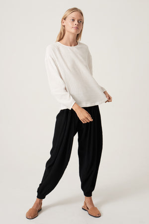 Stylist Notes: A basic long sleeve tee that’s not so basic. With a round neck, drop shoulder and scoop edging detail, The perfect top for both everyday wear and special occasions. Tuck it in and let it blouse or go casual and leave it hanging. Roll up the sleeves for a relaxed-chic feel. A wardrobe essential that will work back with almost any look.