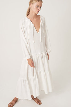 Stylist Notes: That one dress in your wardrobe that always gets compliments! This puff-sleeve, tie-front, two-way dress is waiting for you. Create different looks all year round. Open and loose over a swimming costume in summer. Tie up the ties and add ballet flats for winter. Reverse the dress for a higher neckline at the front and an interesting back detail. True Aussie relaxed styling.