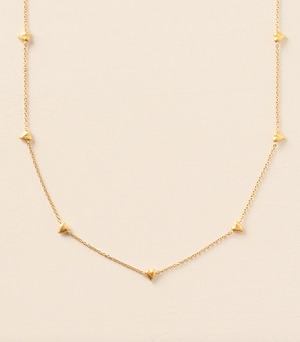 Small golden hearts on a fine chain necklace featuring softly domed, hammered hearts, framed by a delicate beaded halo.