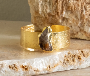 Designed in Australia and handcrafted in Turkey. Each piece has an 18k gold plating with a brass base & is crafted around the shape of the individual stone. The natural beauty reflects in the colour and form of each piece with a play on colour and texture.