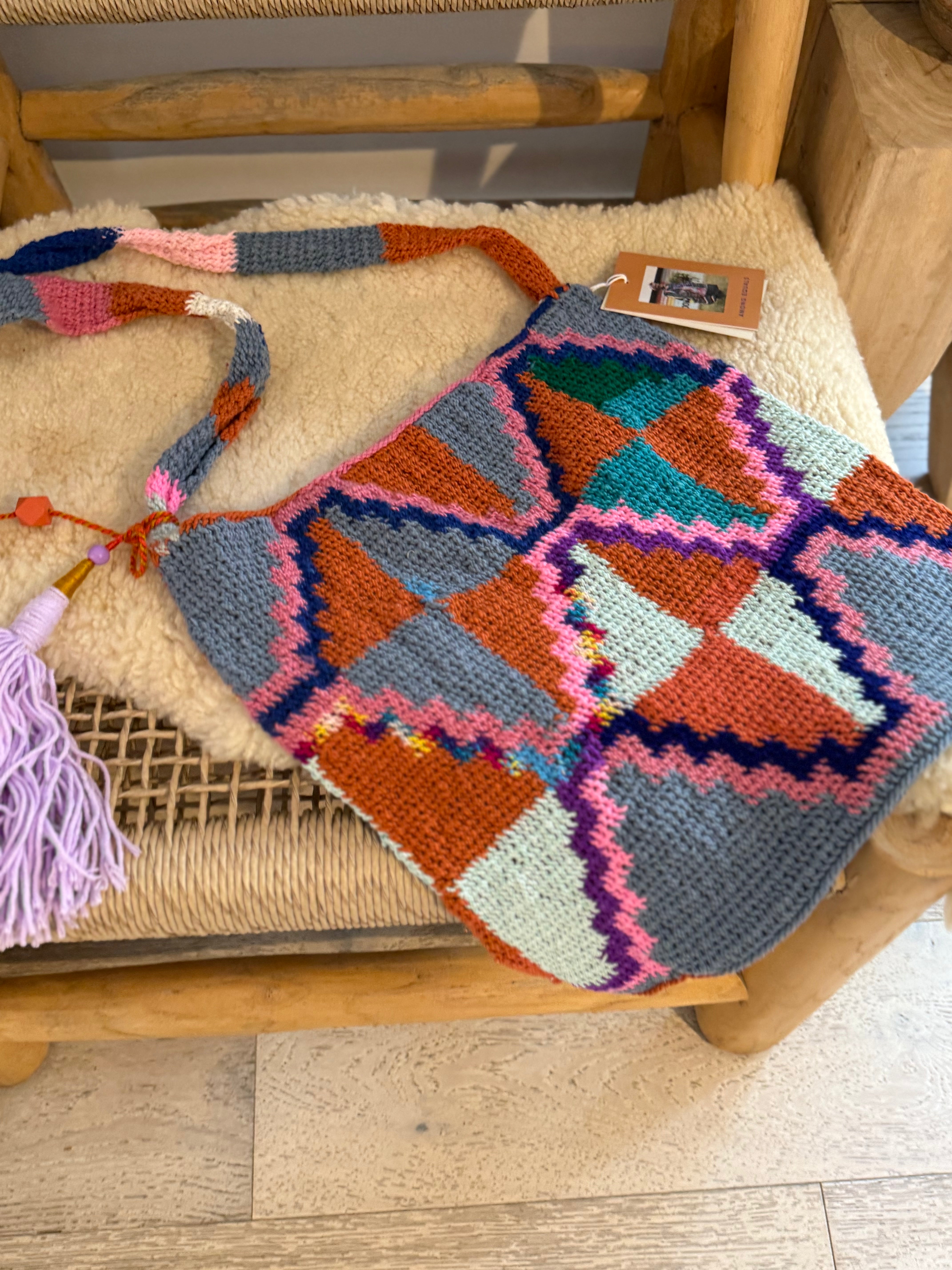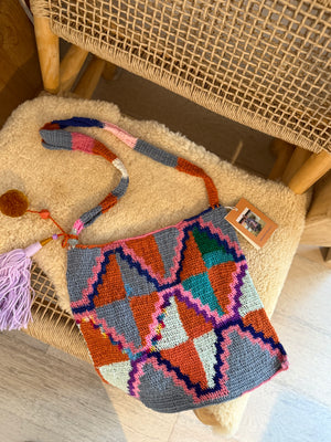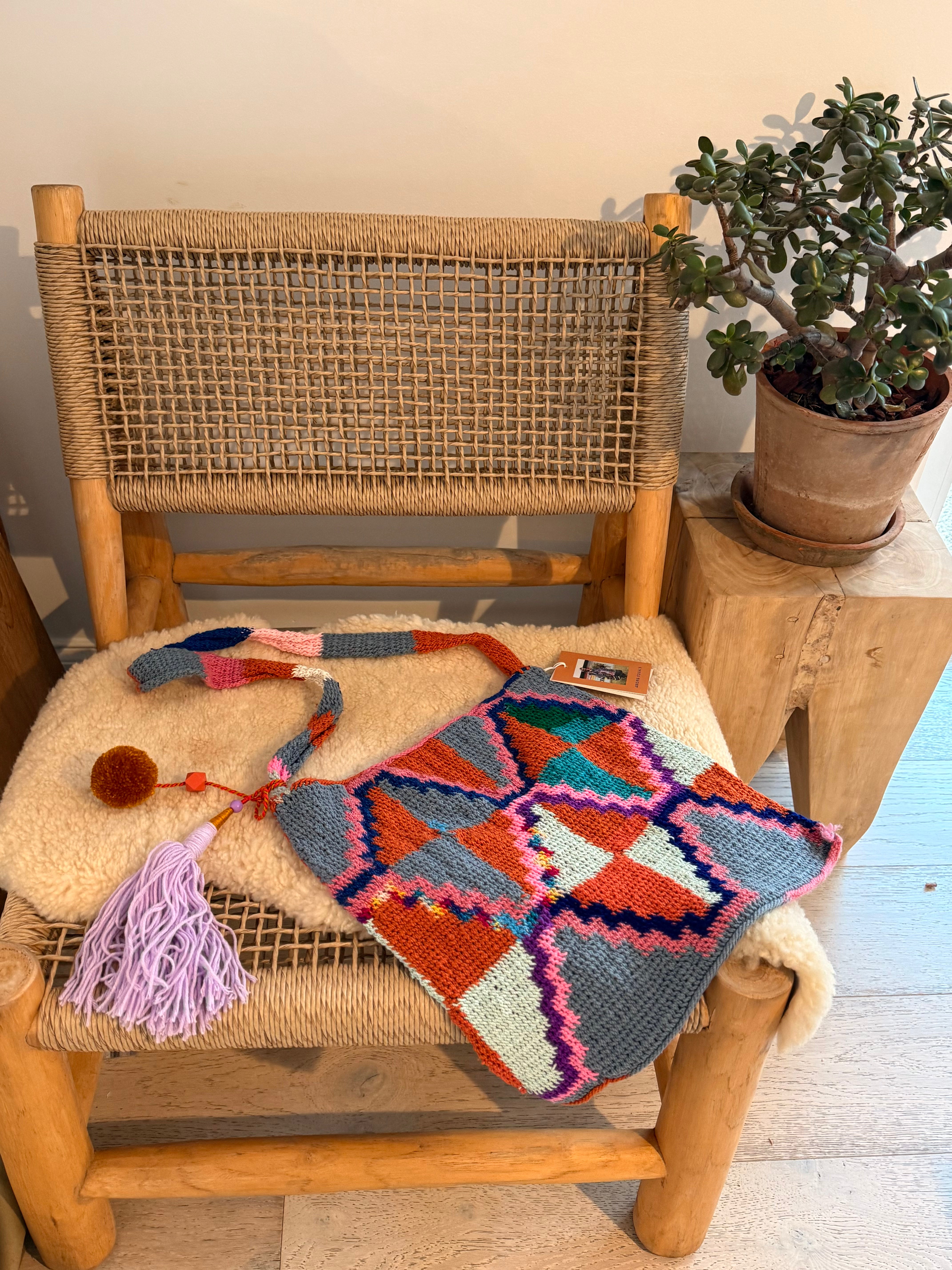 This Bilum is handwoven from acrylic and wool yarn as well as up-cycled knitwear using traditional weaving techniques.