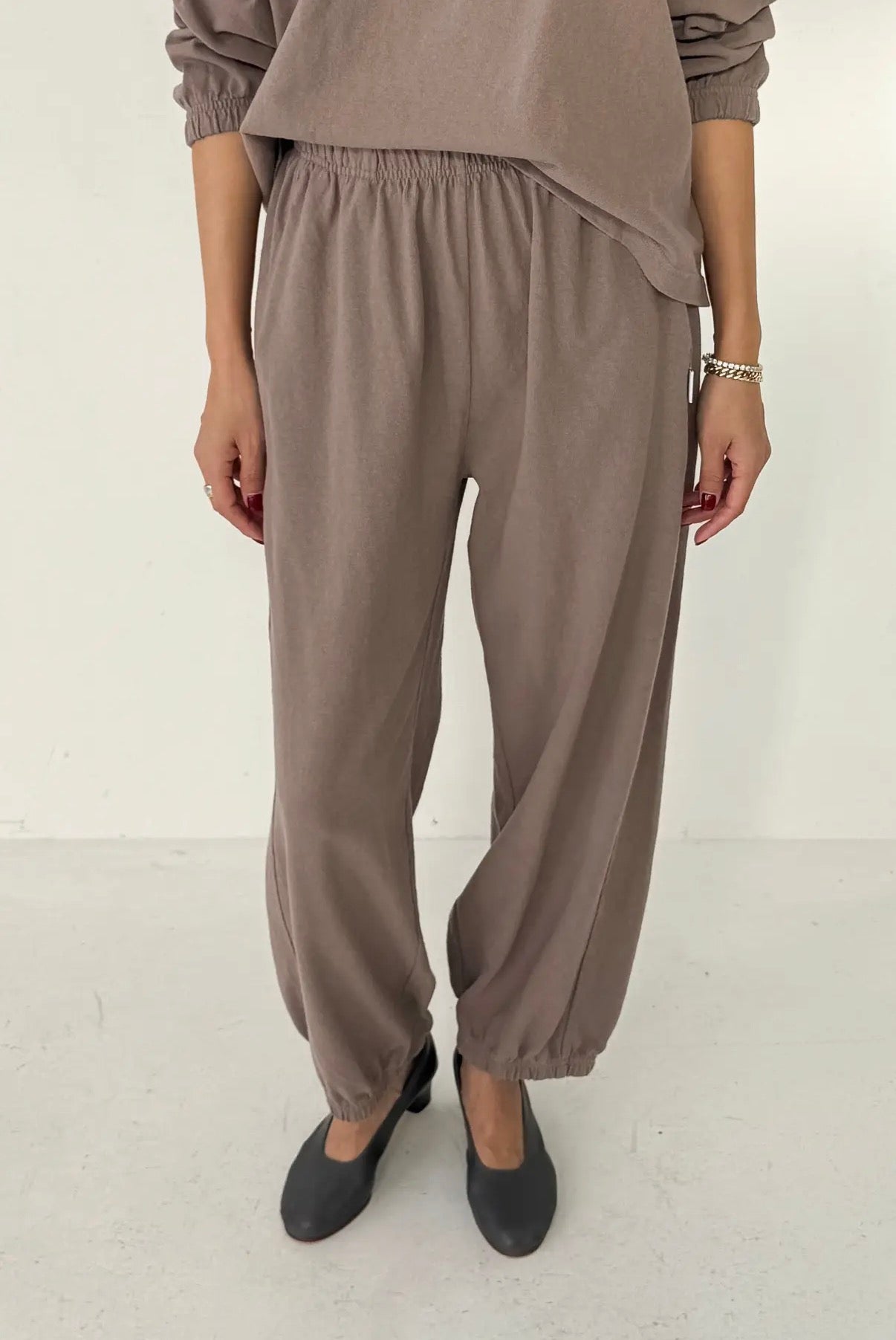 These are the pants we love to live in year round! With an elastic leg opening that pairs with any shoe, comfortable elastic high waist and side slit pockets, she will be your new uniform at home, in the office, around town and even the great outdoors. Gorgeous heavyweight 100 cotton, garment dyed and pre-washed for a rich textured look that is not see-through and does not shrink in the wash.