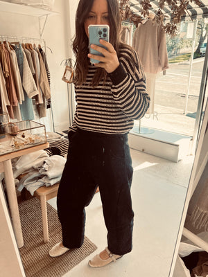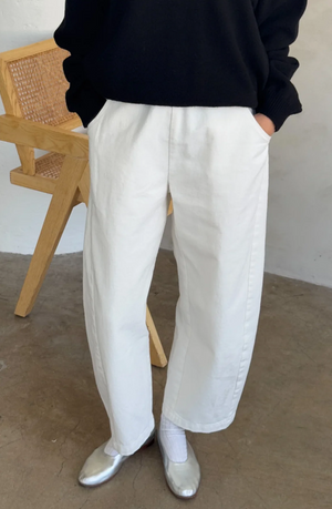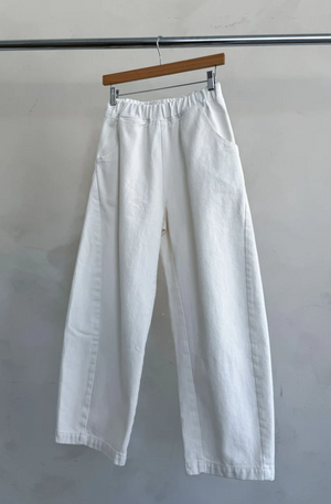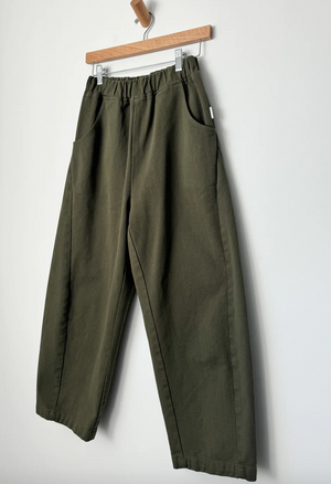 These are the pants you'll love to live in! With thoughtful design details like an elastic high waist that gives you room to breath, slightly curved leg shape, cropped length to show off your favourite socks and shoes, unique side panels and deep pockets. The heavy-weight canvas material likely adds durability and gives them a structured, tailored look.