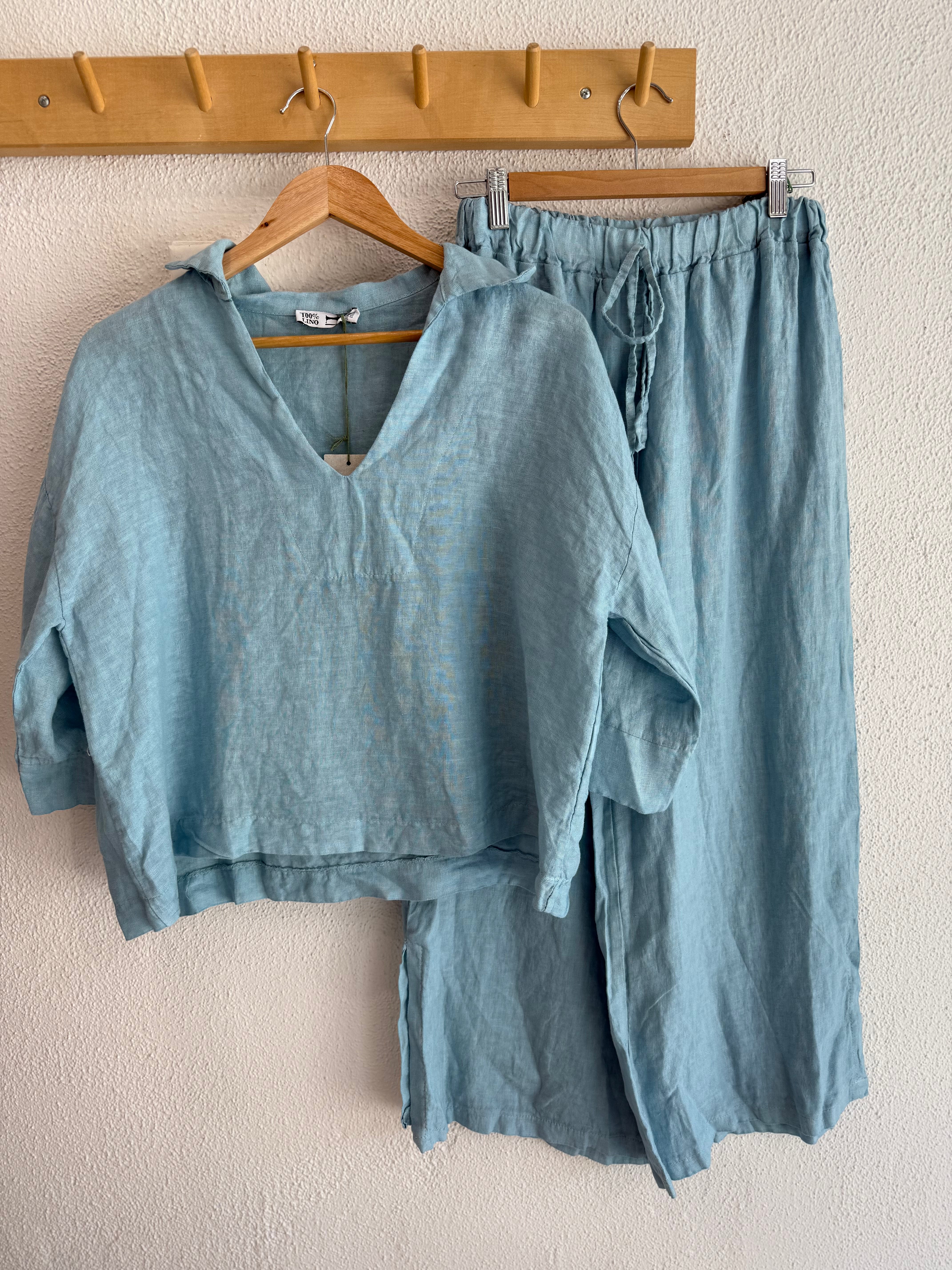 A three quarter sleeve cut at a nice crop length that sits perfectly on the waistline in a light weight linen. The perfect duck egg blue colour-way.