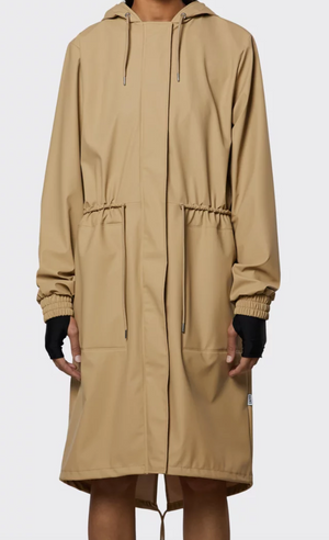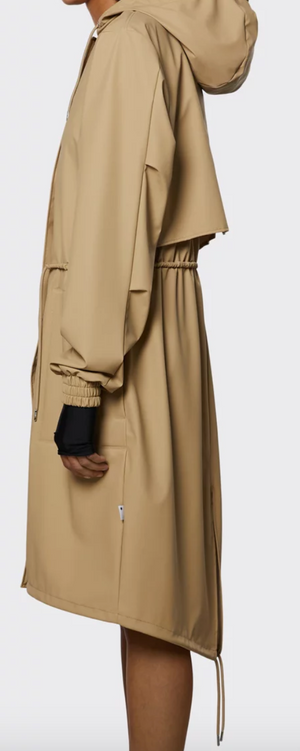 The Rains String Parka highlights a waist sculpting silhouette. A drawstring waist with cord string tunnel updates the basic raincoat and brings it into a great season wardrobe updater. Rains always proving functional with it's hidden ventilation holes, cap brim for the rain and minimal side access pockets.