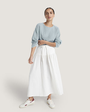 Stylist Notes: Always a lover of a maxi skirt, creating a flattering silhouette is a must and so our new maxi Romance Skirt was born. Fitted on the waist to the hips and flaring out at in all the right places. This skirt can be worn high on the waist or low on the hips, you choose. The drawstring makes it so simple!